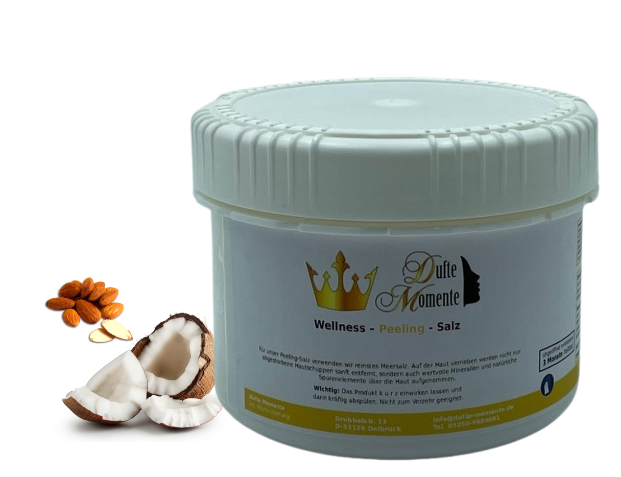 Salz Körperpeeling – aus reinstem Meersalz in BIO-Qualität und hochwertigem Massageöl als Duft- und Pflegekomponente von Dufte Momente – beliebt bei gewerblichen Anwendern wie Hotels, Thermen und anderen Wellness Einrichtungen