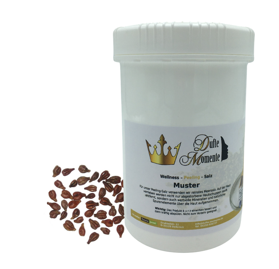 Für das Salzpeeling von Dufte Momente kommt reinstes Meersalz in BIO-Qualität zum Einsatz, das aufgrund seiner feinen kristallinen Struktur als das hochwertigste Natursalz gilt. Als Duft- und Pflegekomponente werden dem Salz kleine Mengen unseres hochwertigen Massageöls, beigemengt. Dieses beinhaltet neben einer Basiskomponente aus Argan-, Mandel-, Sonnenblumen- und Traubenkernöl eine Duftkomponente aus naturreinen und natürlichen ätherischen Ölen.